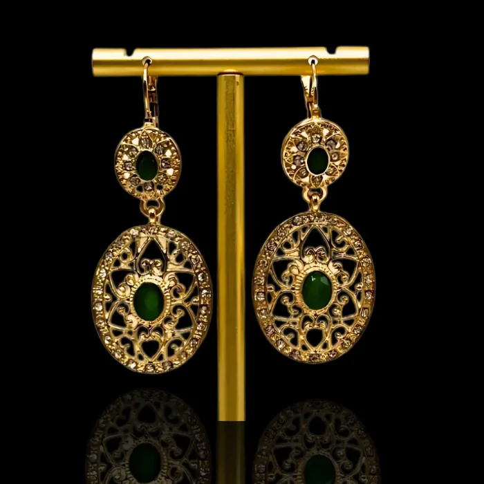 Vous cherchez des boucles d’oreilles en plaqué parfaites pour un mariage ou une soirée habillée ? Ce modèle, orné de pierres vert émeraude, a été pensé pour illuminer votre tenue avec finesse.