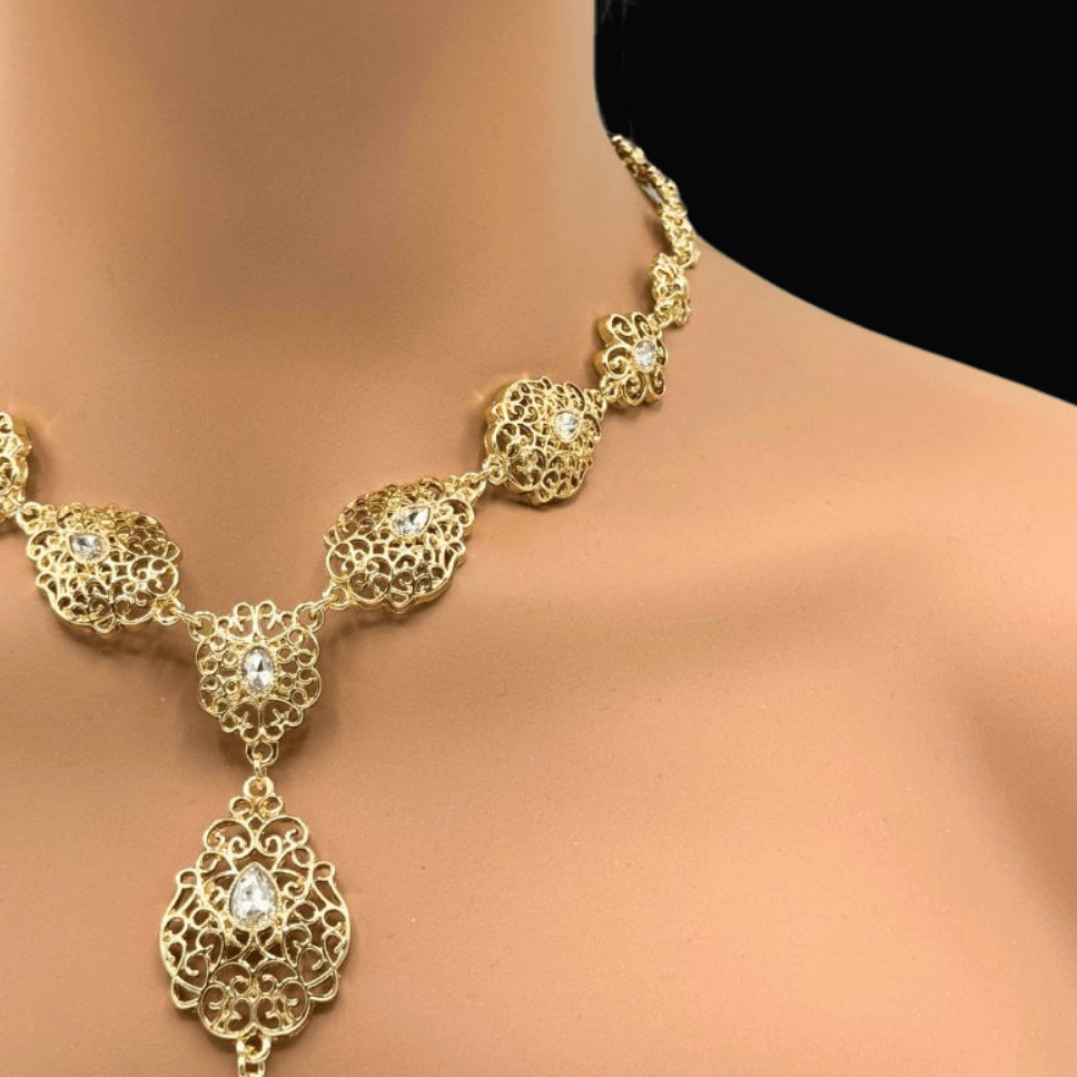 Chaque élément de la parure Nadhera évoque l’élégance des bijoux anciens, revisités pour une femme d’aujourd’hui. Le travail ajouré du métal doré rappelle les ornements festifs des cérémonies intemporelles, tandis que les pierres synthétiques blanches diffusent une lumière douce et éclatante. Cette parure est idéale pour les mariages orientaux, les fiançailles, ou toute occasion où vous souhaitez être inoubliable.